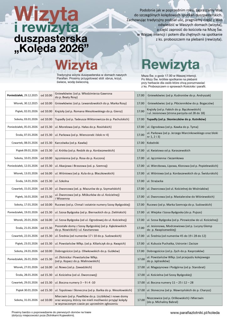 Podobnie jak w poprzednim roku, zapraszamy Was do szczególnych kolędowych spotkań duszpasterskich.